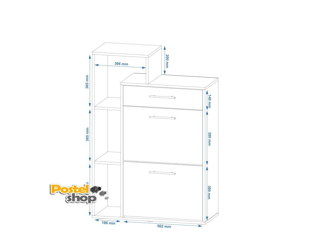 - Regál na boku: 20 cm široký regál poskytuje další prostor pro uskladnění bot nebo jiných věcí, které by se jinak válely po zemi.