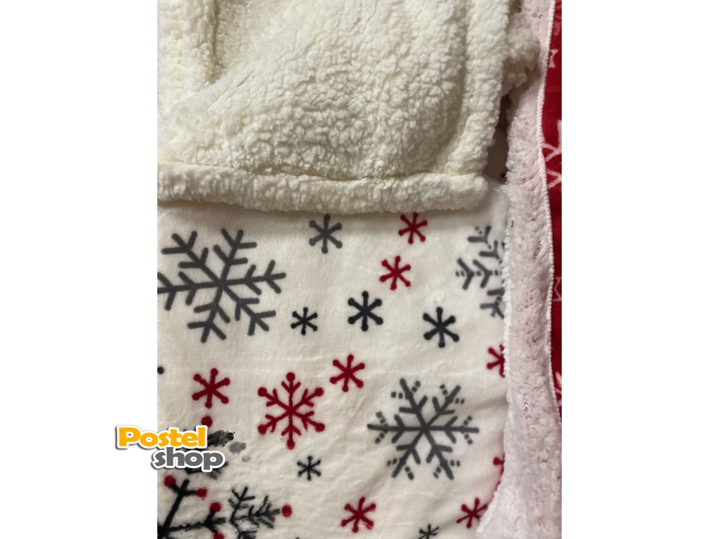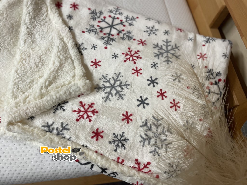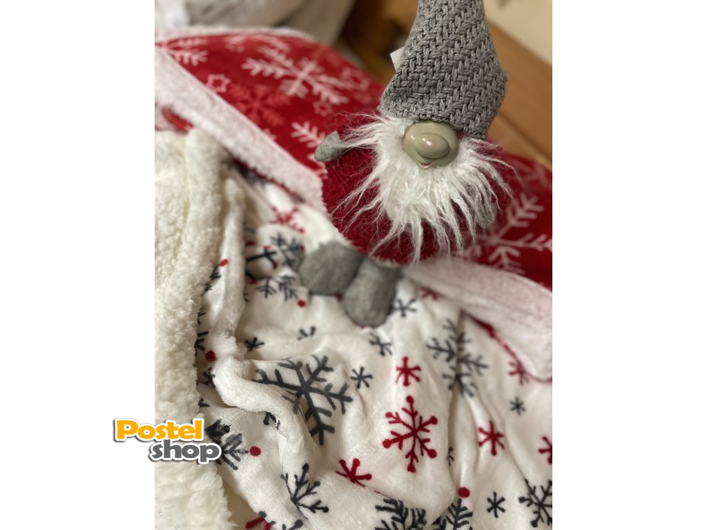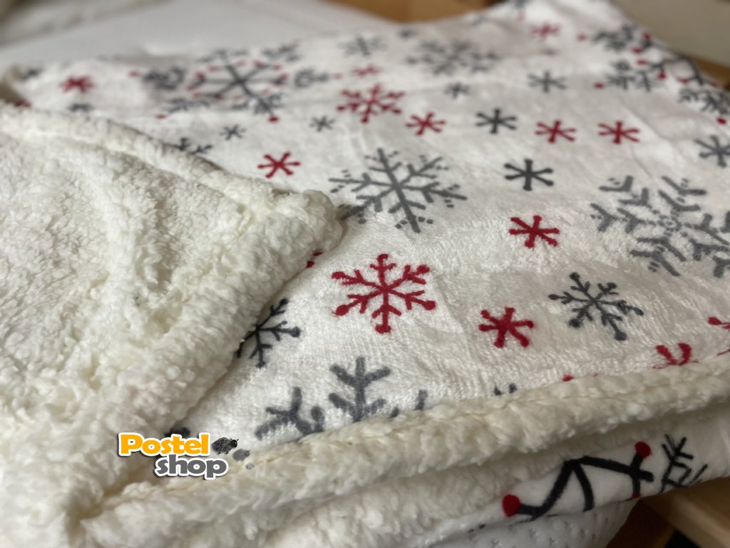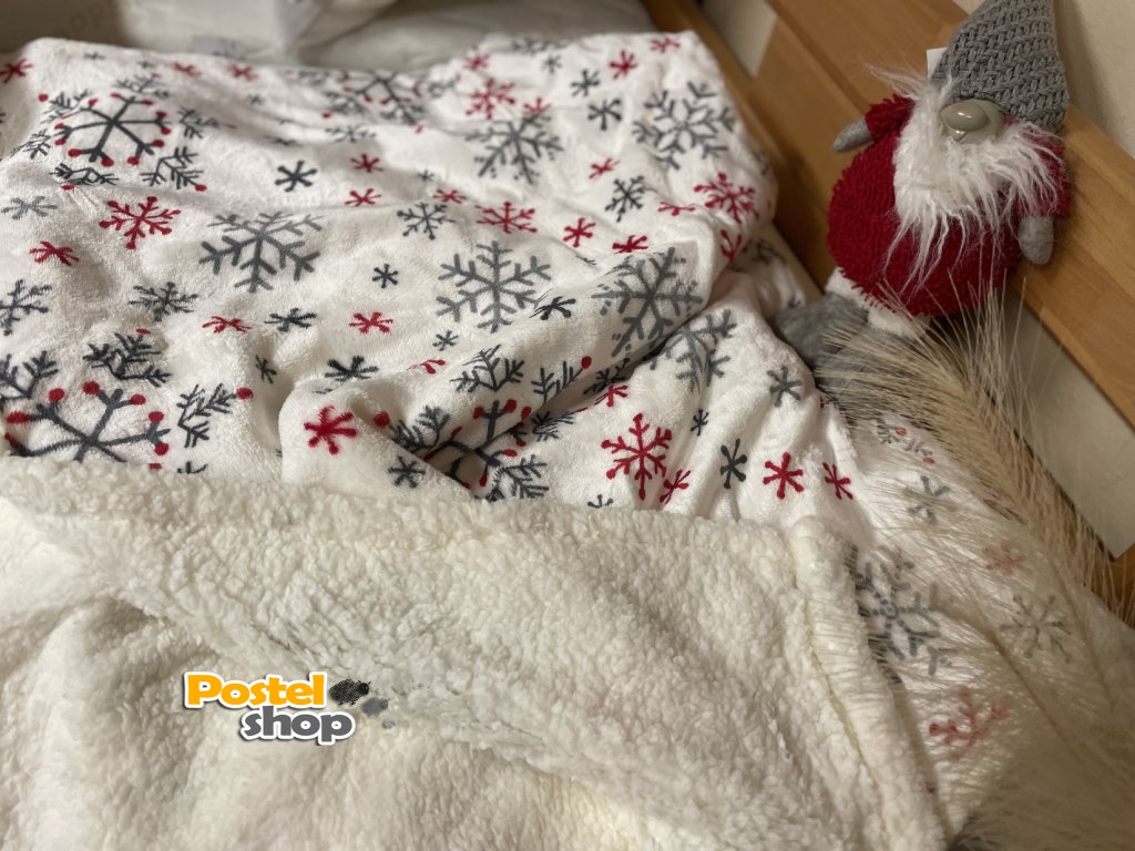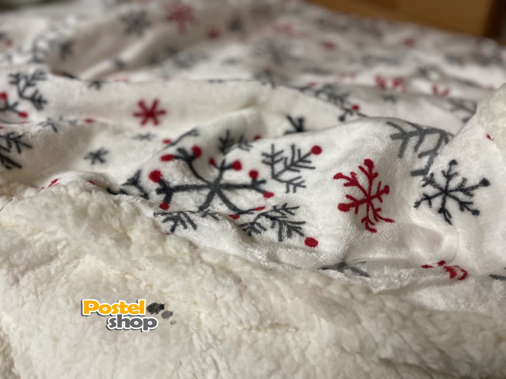 Mikroplyšová deka s beránkem v bílé barvě , šedé a červené vločky je perfektním doplňkem pro zimní večery, kdy oceníte teplo a měkkost na dotek.