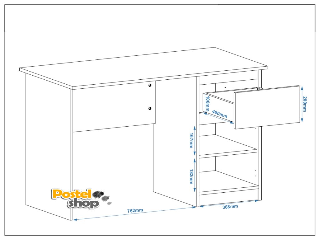 - Funkčnost a organizace: Stůl je vybaven praktickými zásuvkami a skříňkou pro snadné uspořádání dokumentů, kancelářských potřeb a dalších věcí.