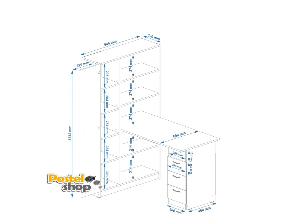 - Úspora místa: Díky skříni a regálu máte vše, co potřebujete, přímo na dosah, což zaručuje čistý a organizovaný pracovní prostor.