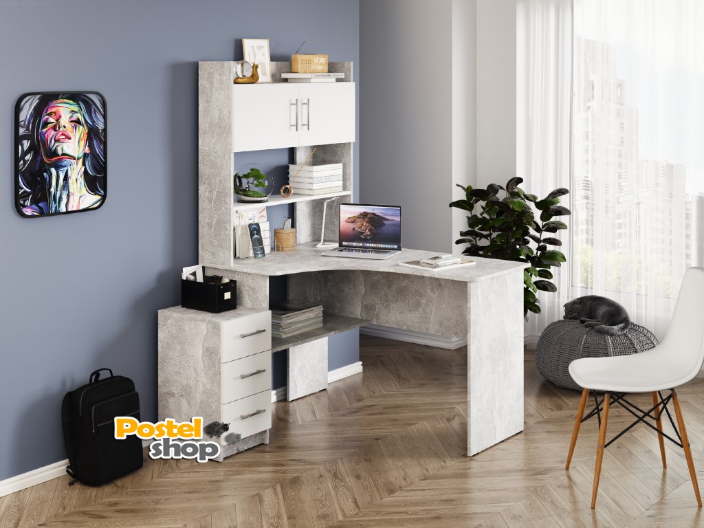 Tento moderní rohový psací stůl s nástavcem a zásuvkami je perfektní volbou pro každého, kdo hledá kombinaci praktického uspořádání a stylového designu. Díky rohovému provedení šetří místo, přičemž nabízí dostatek prostoru pro všechny vaše pracovní potřeby. Nástavec poskytuje přehledné uspořádání pro dokumenty a další kancelářské potřeby, zatímco zásuvky zajišťují dostatek úložného prostoru pro všechny vaše věci.