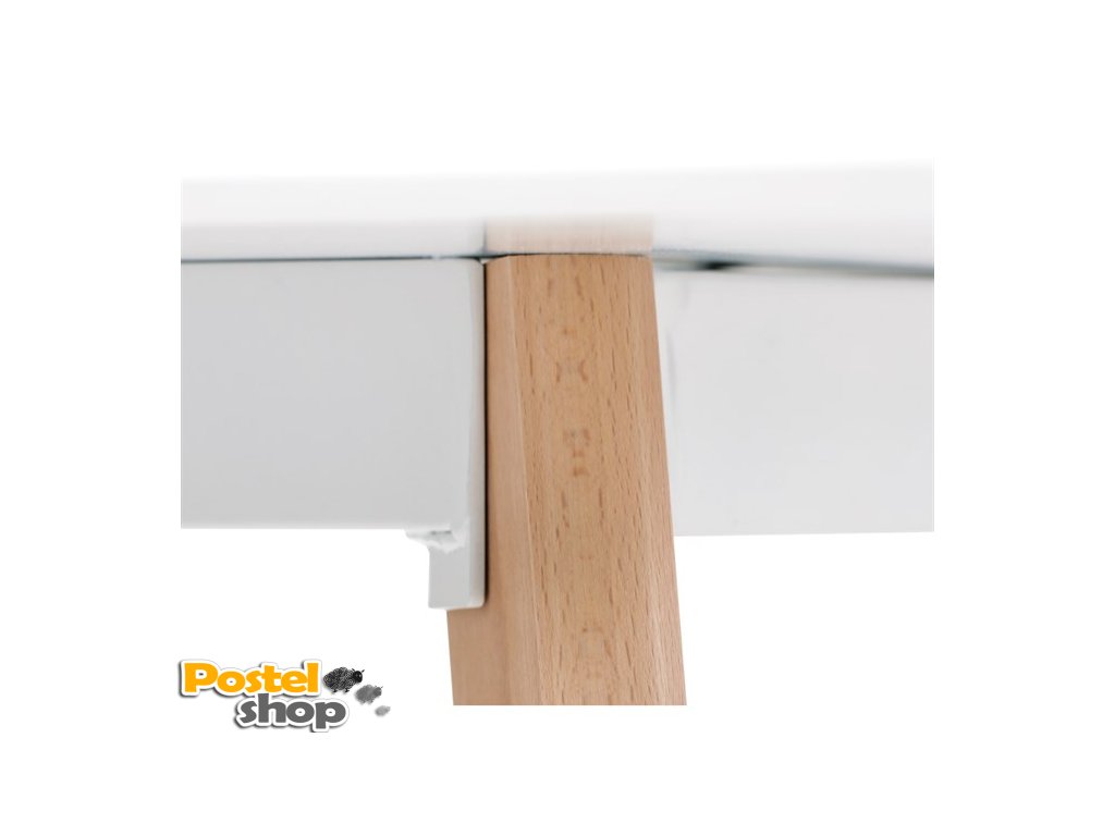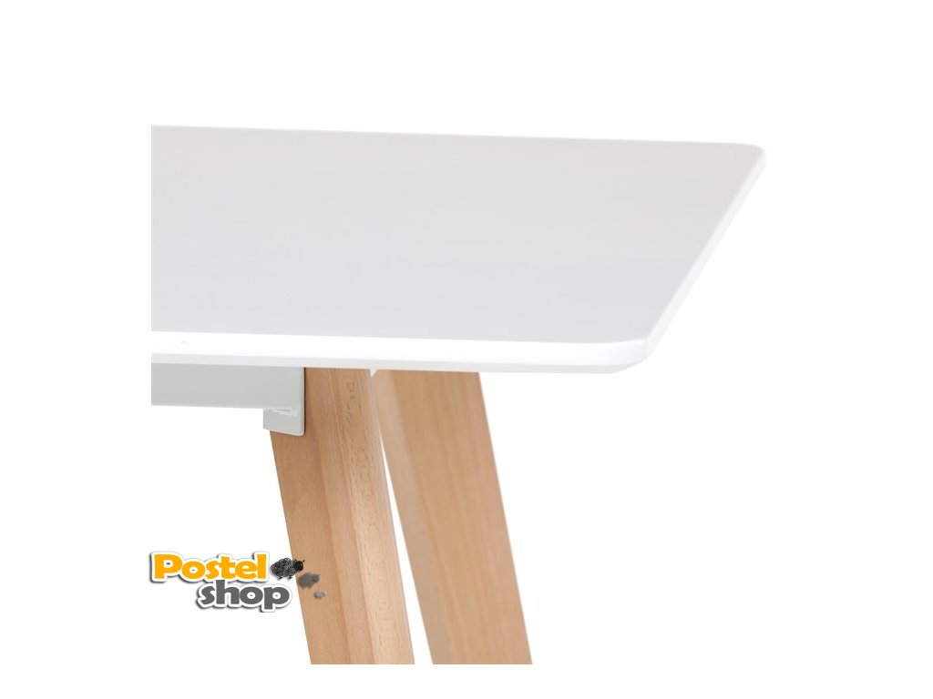 Jídelní stůl o rozměrech 80x80x74 cm kombinuje pevnou desku z MDF s matnou bílou povrchovou úpravou a stabilní nohy z masivního buku.