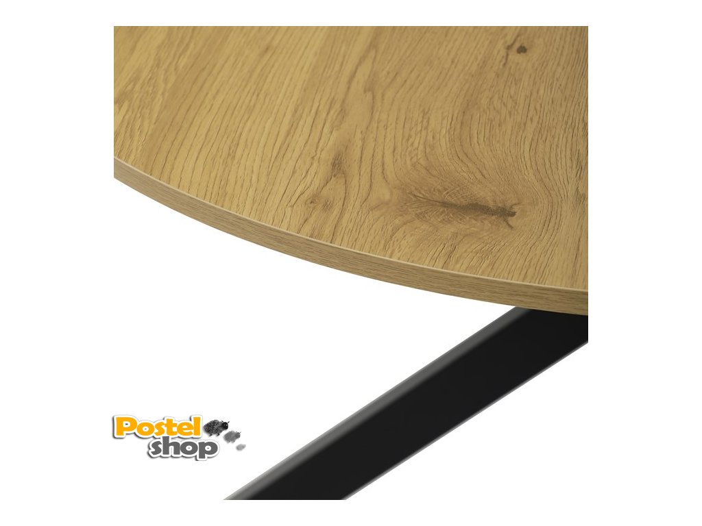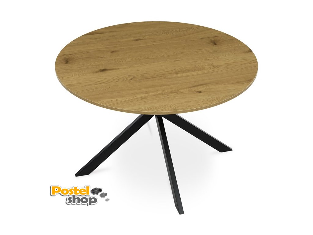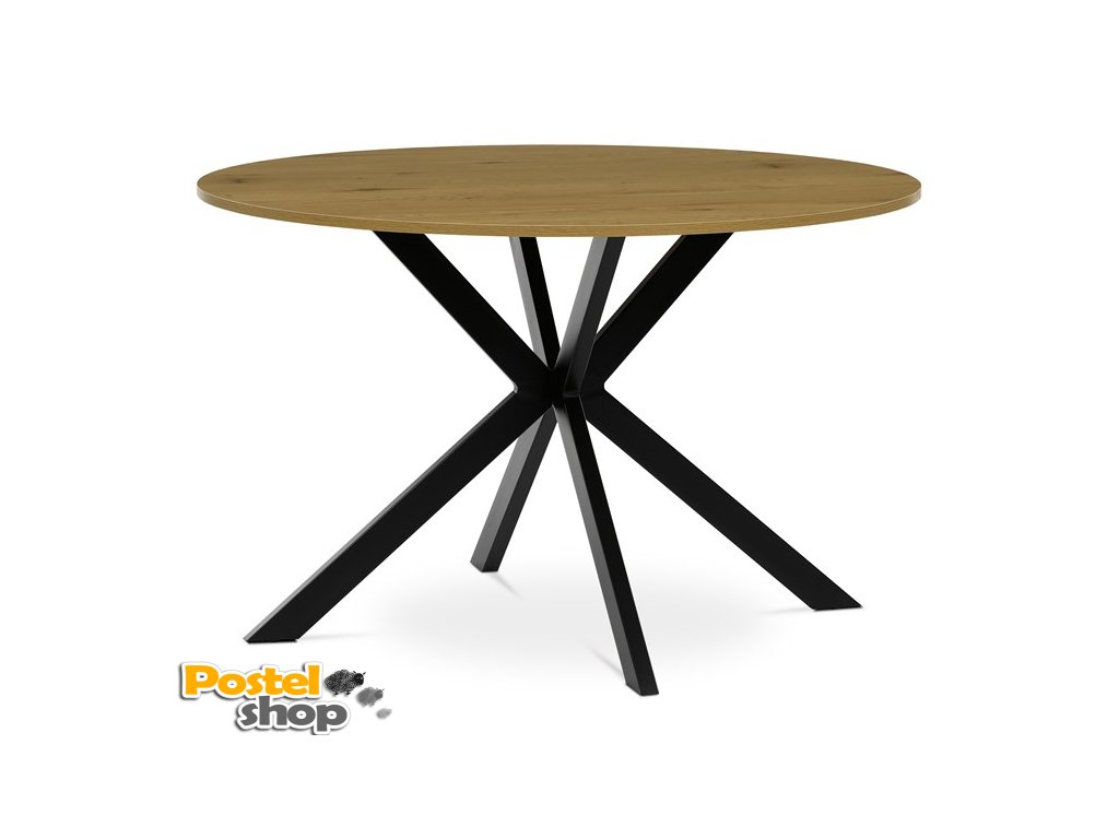 Jídelní kulatý stůl HT-F4120 OAK vyniká kombinací přírodního dekoru divokého dubu a robustní konstrukce s černými kovovými nohami.
