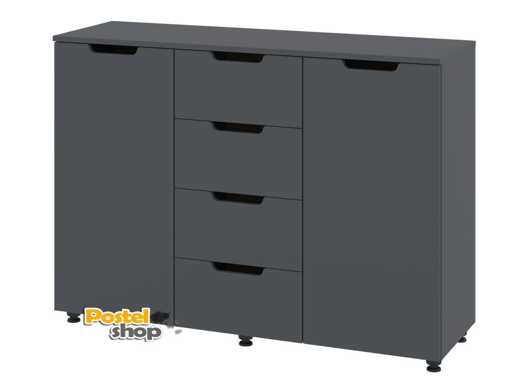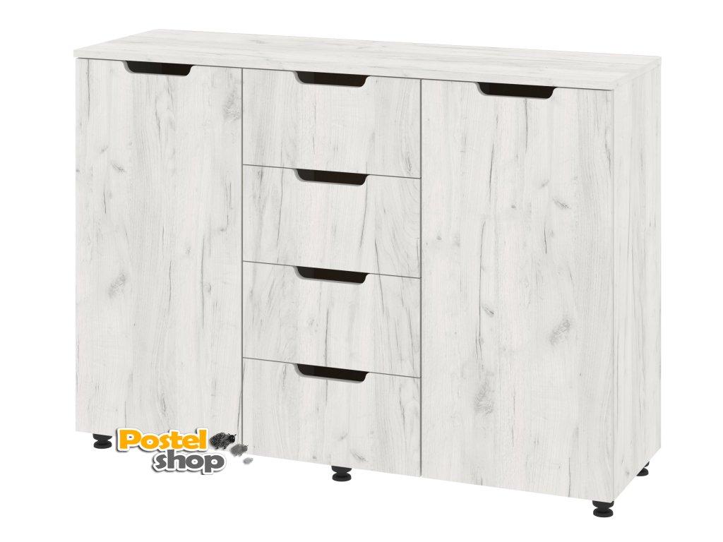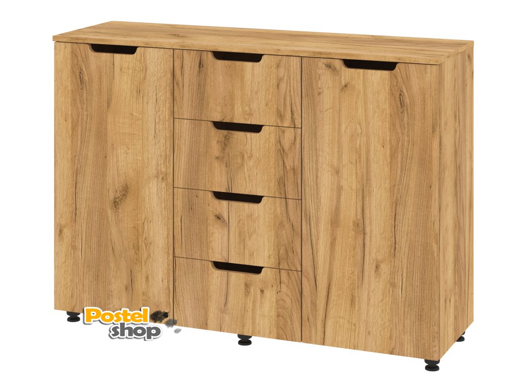 Komoda K-4+2 EKO je moderní a funkční nábytek, který kombinuje čtyři prostorné zásuvky a dvě dvířka po stranách pro maximální úložný prostor. Díky tomuto designu nabízí komoda dostatek místa pro různé předměty, od oblečení až po domácí dekorace, a to jak v zásuvkách, tak za dvířky. Je vyrobena z kvalitního lamina, což zaručuje její dlouhou životnost a snadnou údržbu. K dispozici je v několika barevných provedeních, takže si ji snadno přizpůsobíte do vašeho interiéru.