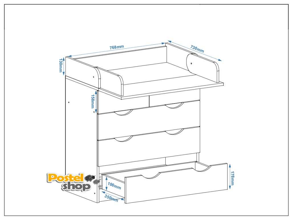- Bezpečné přebalování – Komoda poskytuje stabilní a pohodlný prostor pro přebalování s dostatečným místem pro všechny potřebné věci.