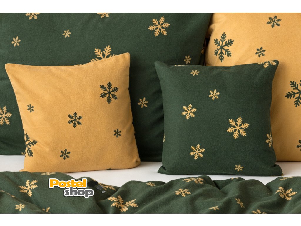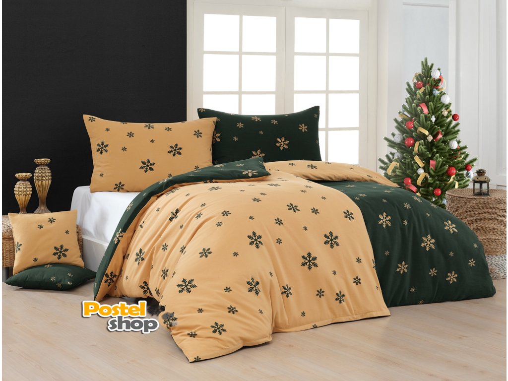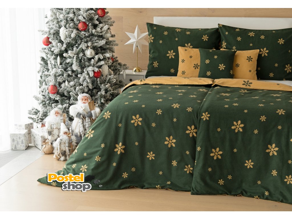Vánoční povlečení Vločky zelené vykouzlí ve vaší ložnici nezaměnitelnou sváteční atmosféru. Tradiční sytě zelenou barvu rozzáří sněhové vločky medově hnědé barvy, druhá strana ložního povlečení je provedena inverzně.