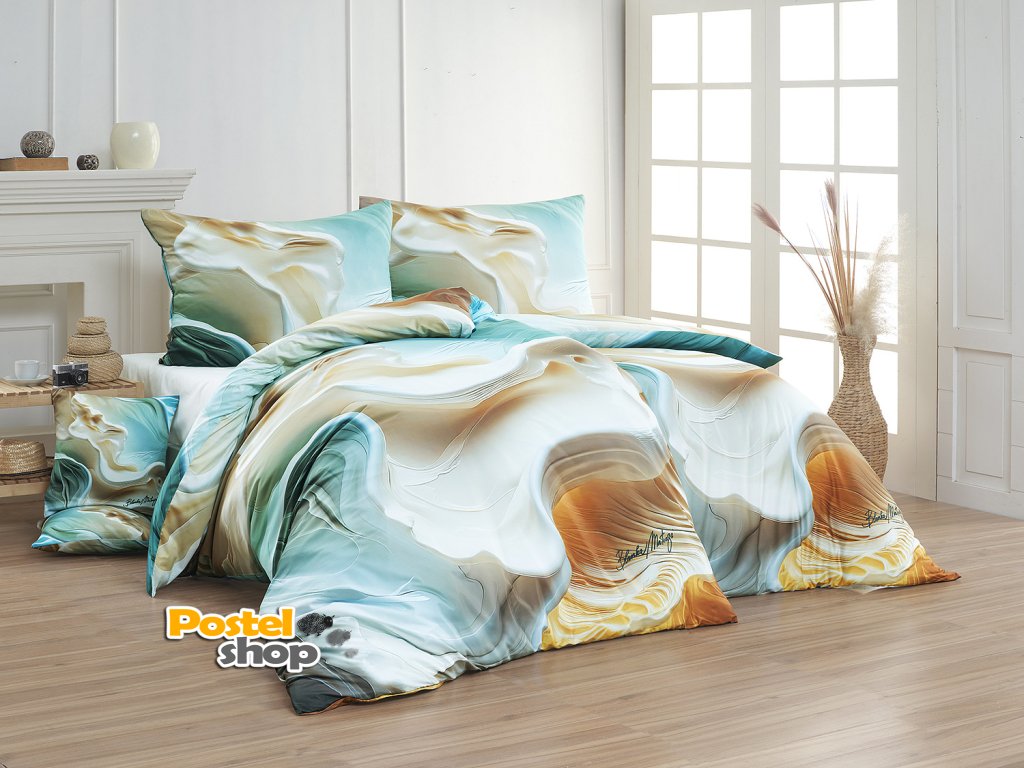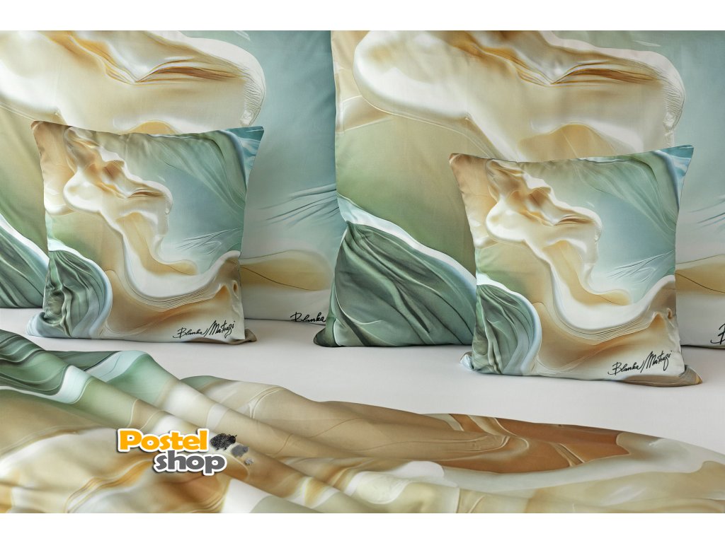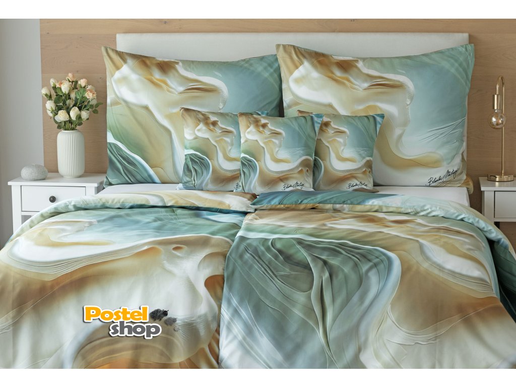 V tomto autorském digitálně zpracovaném motivu se harmonicky prolínají krémové, béžové a mátově zelené odstíny, zvýrazněné zářivým jantarovým tónem. Nejmodernější digitální tisk zajišťuje věrný detail přesně dle autorčina záměru, motiv je z obou stran povlečení stejný.