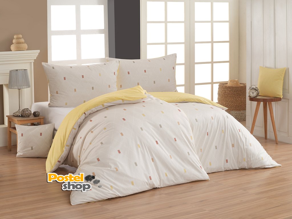 Užijte si hravé stlaní s bavlněným povlečením Bennett, které se stane decentní ozdobou každého interiéru, od moderní minimalistické ložnice až po ložnici v horské chaloupce. Vrchní stranu povlečení zdobí geometrický vzor se žlutými, cihlovými a béžovými obdélníčky na přírodním béžovém podkladu. Na spodní straně povlečení je zjednodušený geometrický vzor na vanilkově žlutém podkladu.