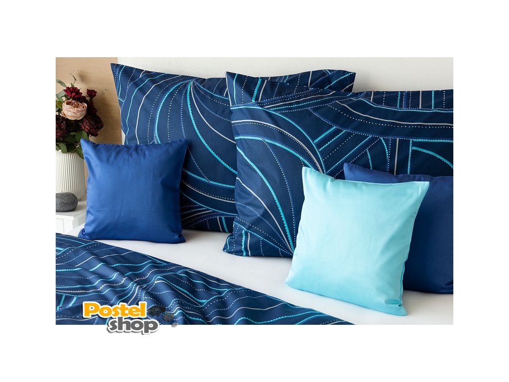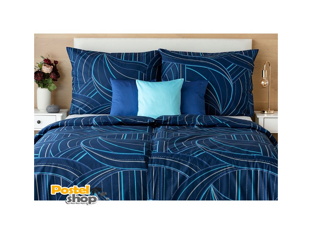 Bavlněné povlečení Ezio Blue s originálním geometrickým vzorem se stane ozdobou každého moderního interiéru. Podklad v tmavě modré barvě zdobí obrazce tvořené linkami v odstínech modré, tyrkysové a šedé. Plastičnost vzoru dokreslují jemné bílé tečky v konturách linek.