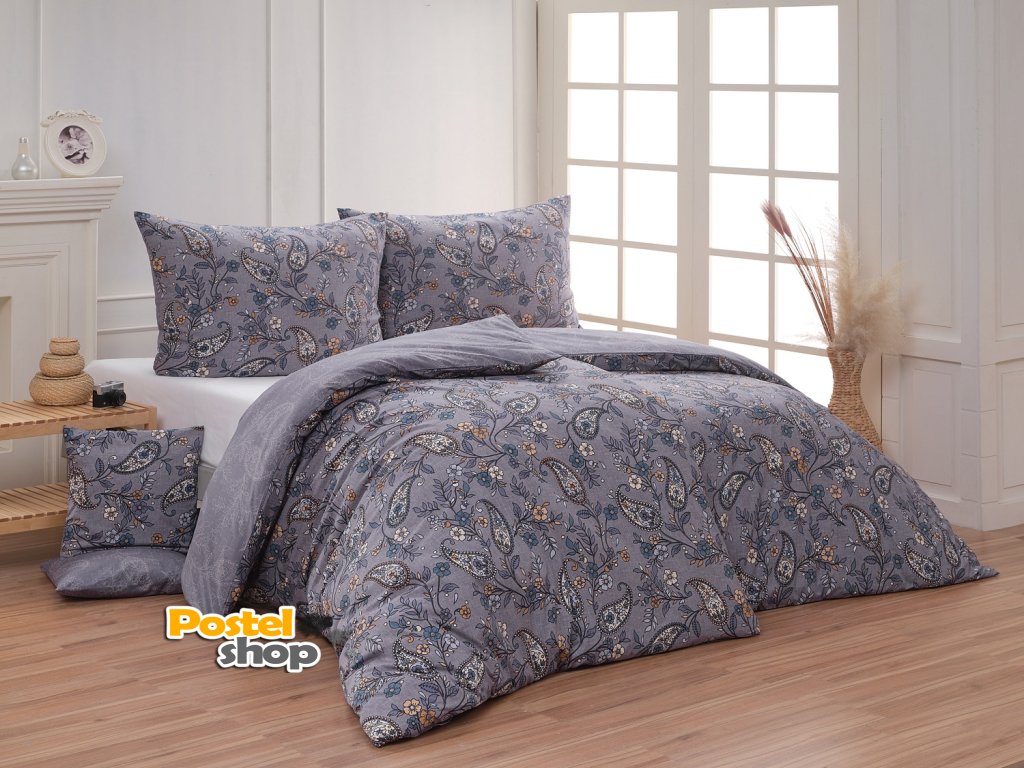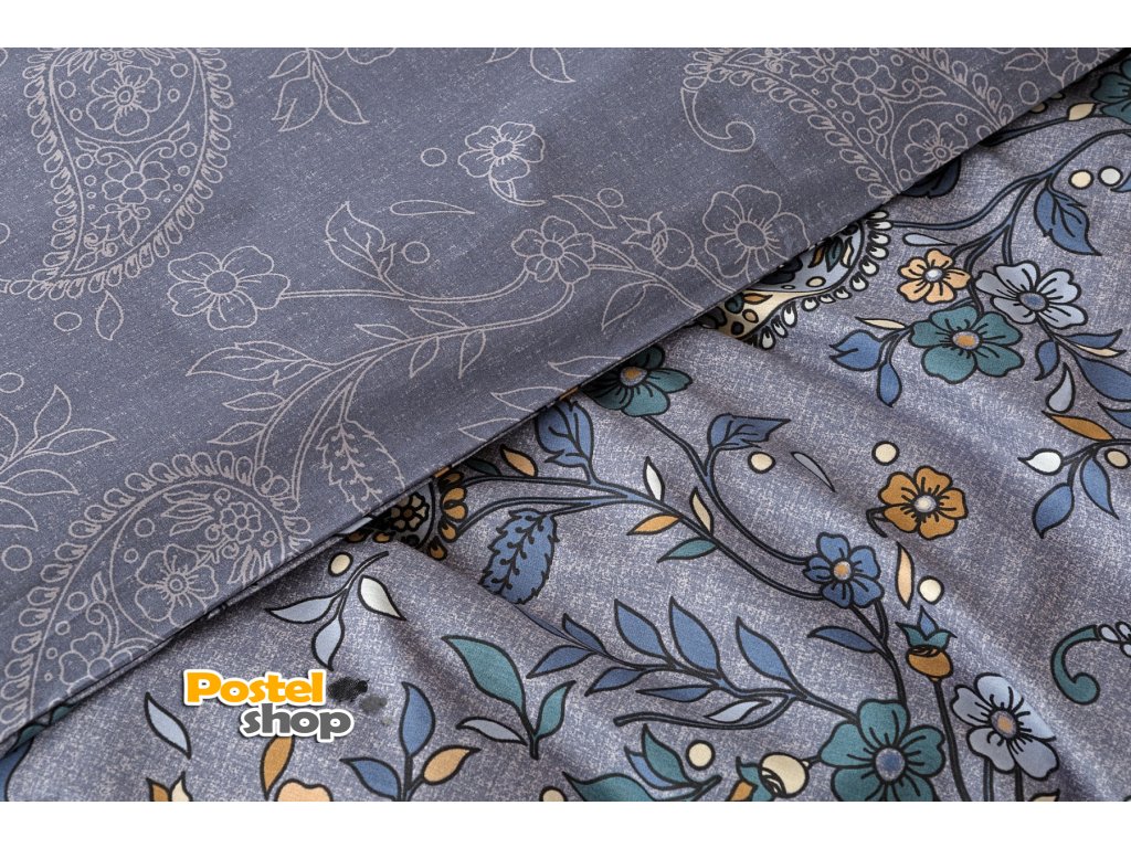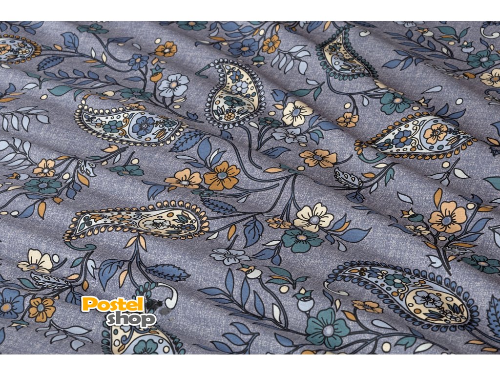 Půvabný paisley vzor je na vrchní straně povlečení barevný, snoubí se v něm odstíny modré, petrolejové, béžové a meruňkové barvy.