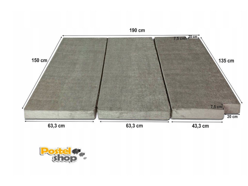 Skládací matrace do auta 3 dílná transportér s VISCO pěnou VW T5, T6 šedý samet - 150x190cm /10cm