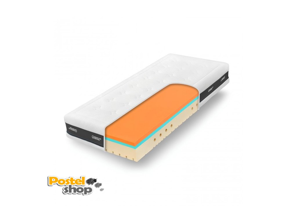 Odolná matrace; paměťová a studená pěna Flexifoam®; 7 zón; ramenní kolébka; zesílená pánevní část měkčí strana s bio línou pěnou, z druhé strany tužší pružnou studenou Flexifoam pěnou.