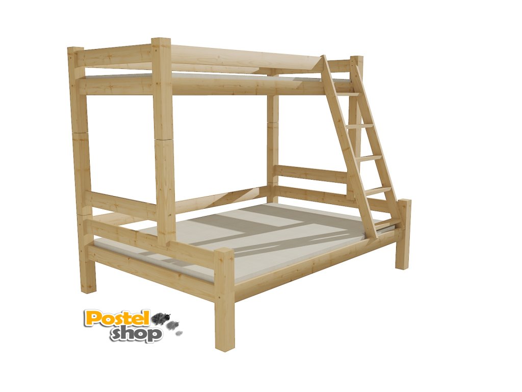 Patrová postel s rozšířeným spodním lůžkem je vyrobena z masivu borovice.