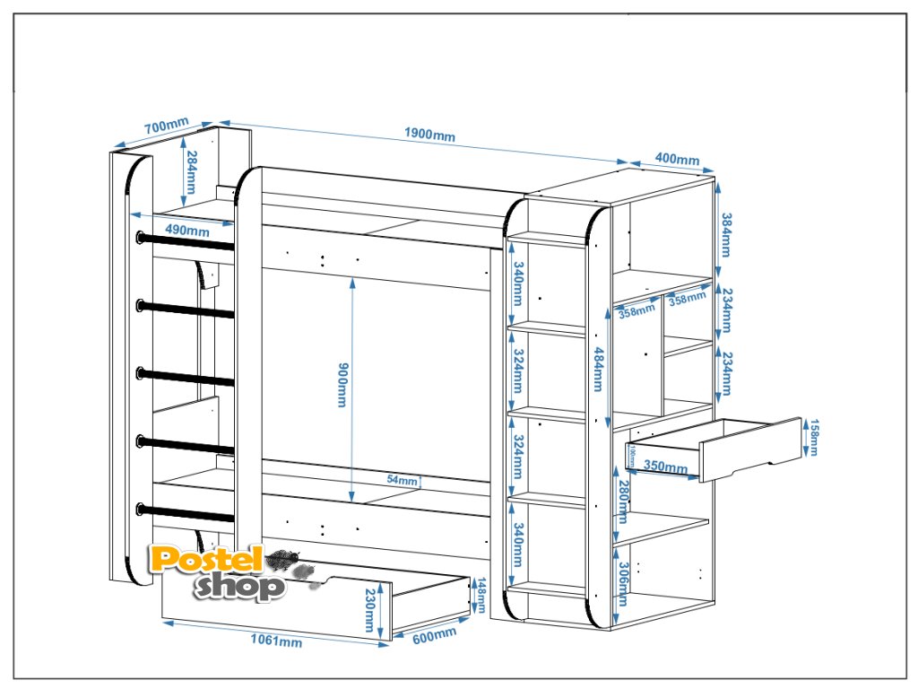 - Praktické úložné prostory: Regály, skříňka a zásuvka jsou skvélé pro organizaci hraček, knih nebo oblečení. Udržujte pokoj čistý a uklizený.