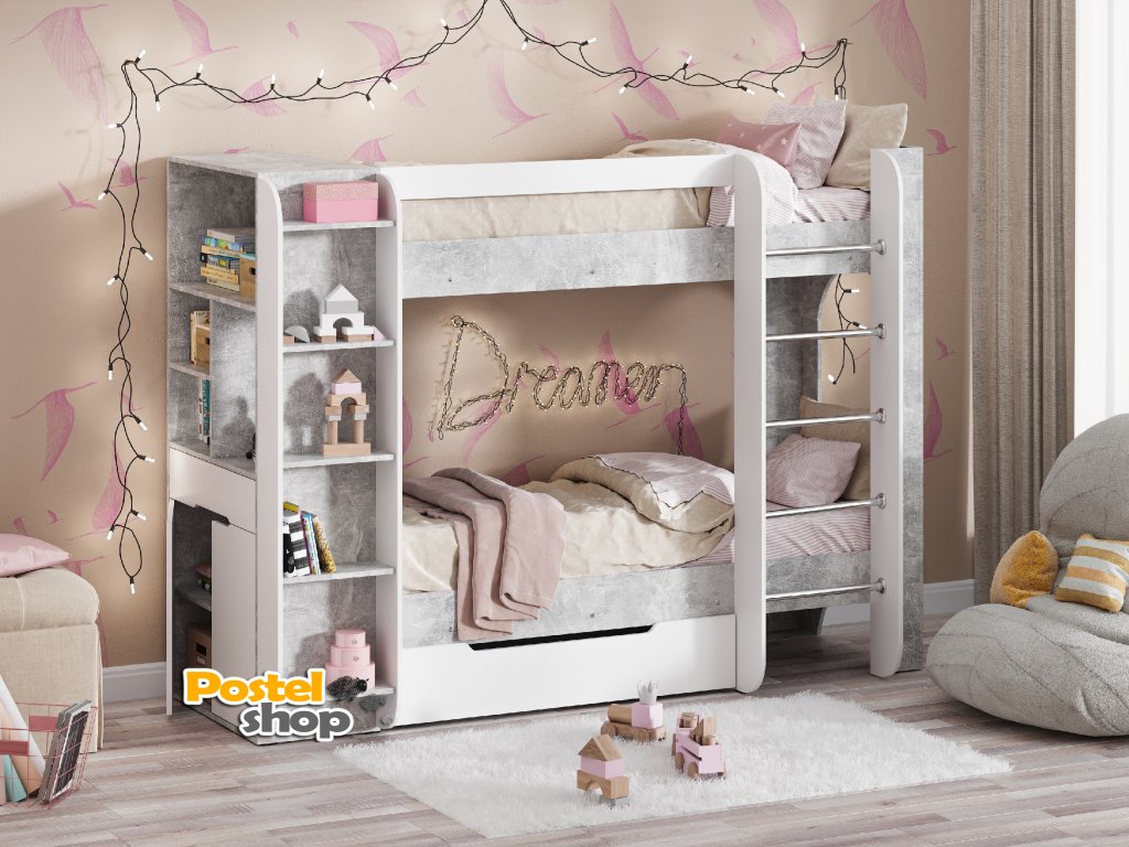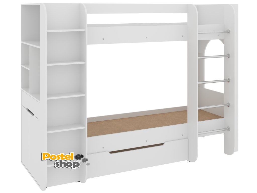 Dětská patrová postel DUET-4 je ideálním řešením pro úsporu místa v dětském pokoji, aniž byste museli slevovat z pohodlí a stylu. Díky integrovaným policovým regálům, skříňce a praktické zásuvce nabízí nejen pohodlné spaní, ale i dostatek úložného prostoru pro všechny dětské věci. S tímto designem si váš malý průzkumník bude moci uspořádat svůj prostor podle svého přání.