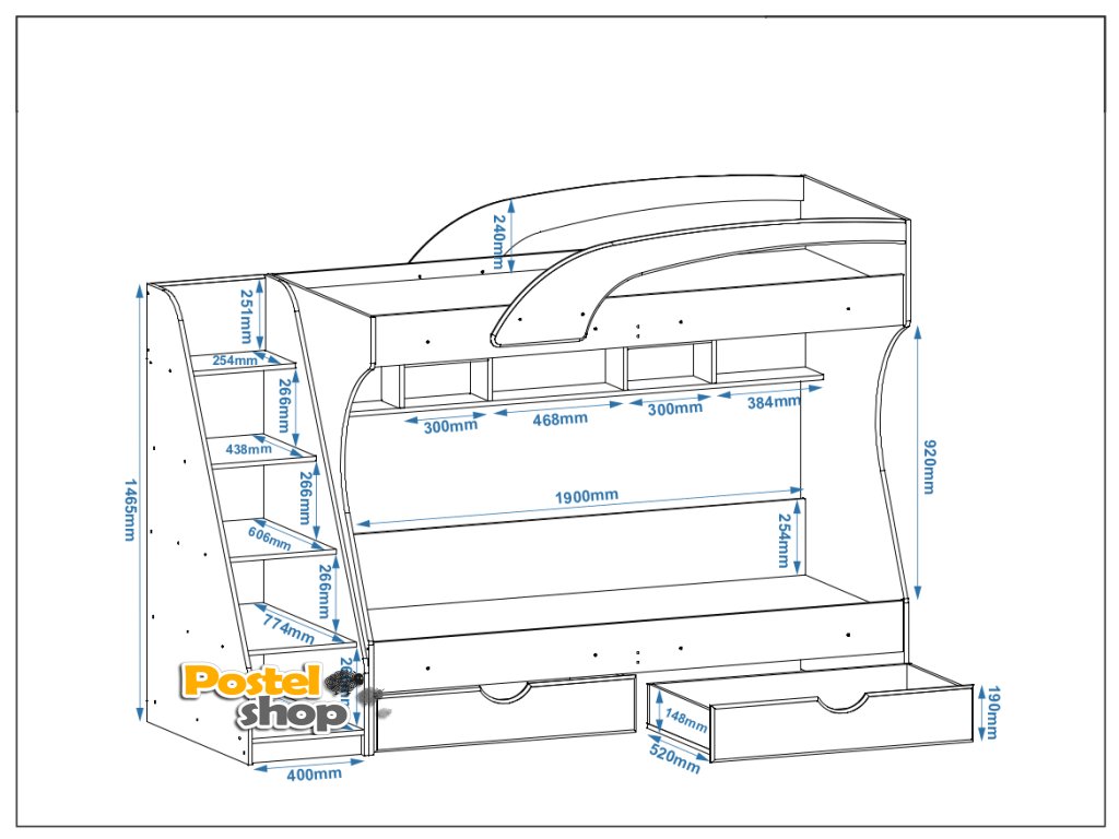 - Praktické úložné prostory: Zásuvky pod postelí a police uvnitř postele poskytují dostatek místa na uložení všeho, co vaše dítě potřebuje.