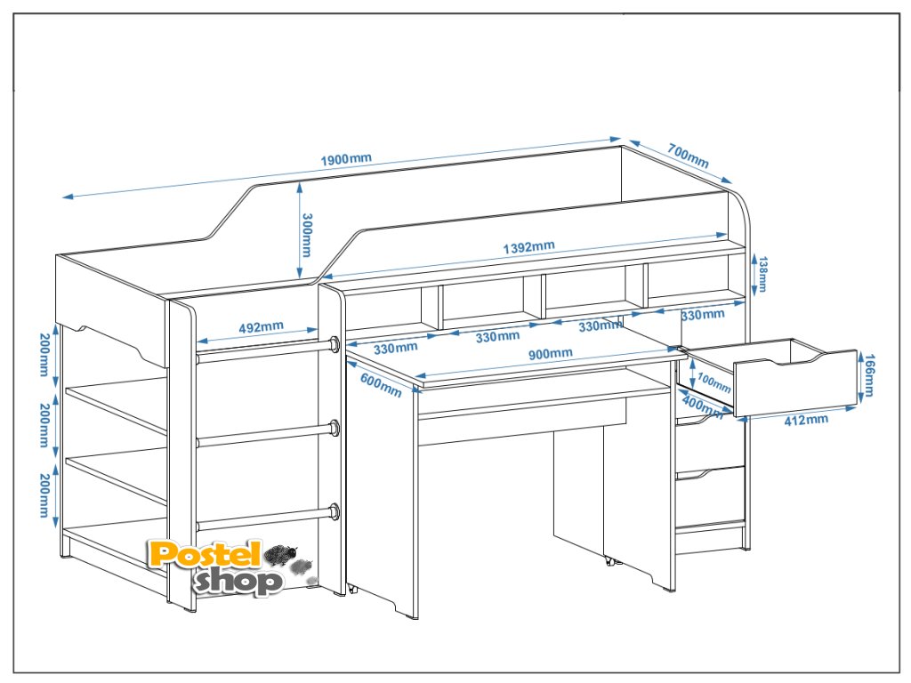 - Kompletní set pro dětský pokoj: Postel obsahuje výsuvný psací stůl, zásuvkovou komodu a skříňku v jednom. Umožňuje efektivní organizaci pokoje a nabízí místo pro uložení knih, hraček nebo oblečení.