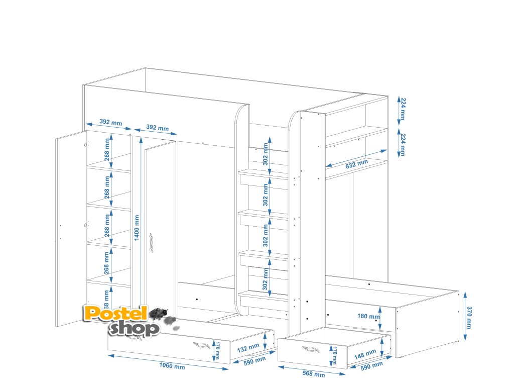 - Rozměry, které se hodí: Celková výška postele je 176 cm, délka 275 cm a šířka 101 cm. Šířka skříně je 80 cm, což znamená dostatek úložného prostoru i pro širší výběr dětských věcí.
