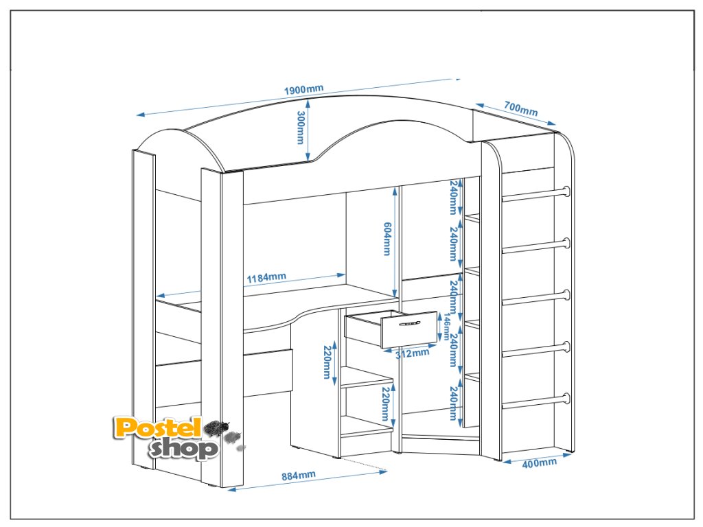 - Úspora místa – Patrová postel ORBITA efektivně využívá prostor díky konstrukci s psacím stolem a šatní skříní v jednom.