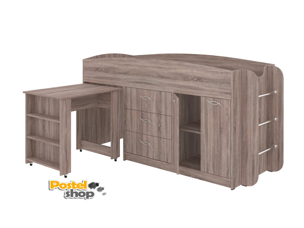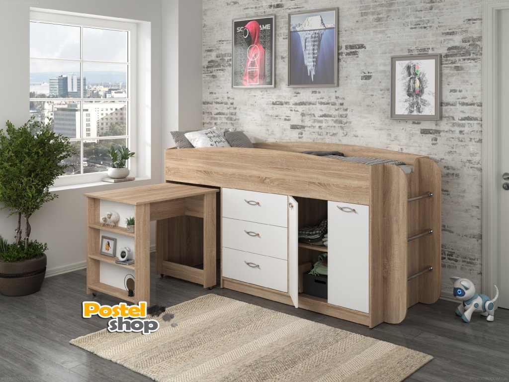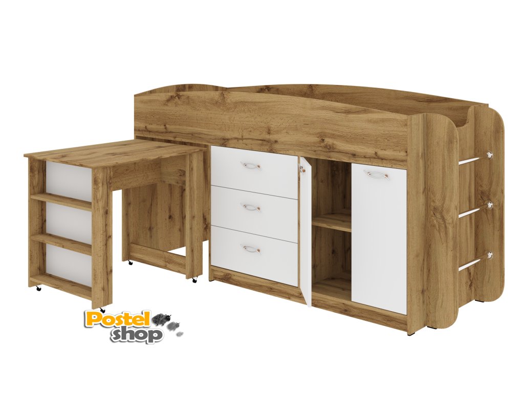 Představujeme vám ideální řešení pro optimální využití prostoru v dětském pokoji – zvýšenou patrovou postel POLUS. S moderním designem a funkčními detaily, jako je výsuvný psací stůl, zásuvková komoda a skříňka v jednom, vám tato postel nabídne nejen kvalitní místo k odpočinku, ale i dostatek úložného prostoru pro všechny potřeby vašeho dítěte.