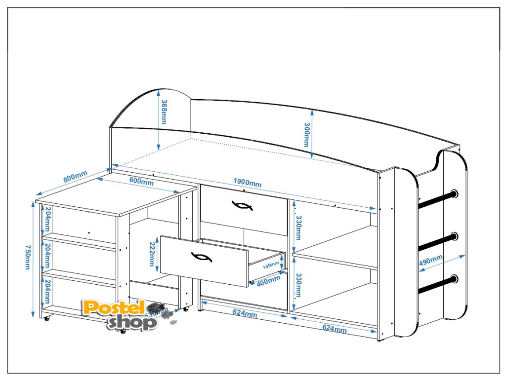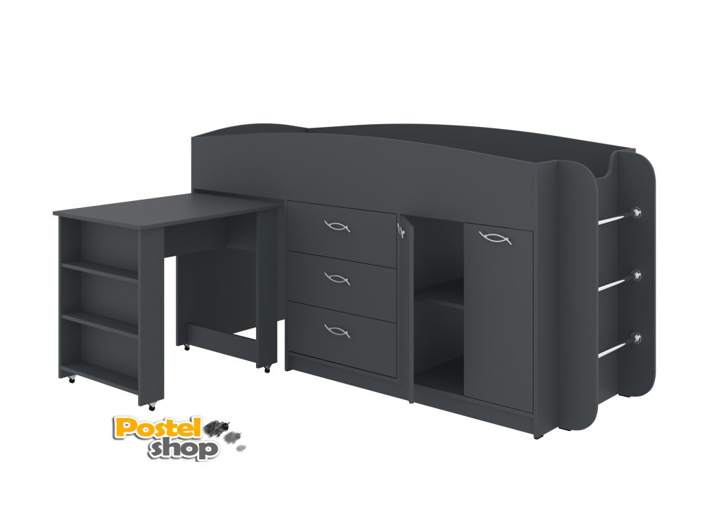 Dětská zvýšená postel 190x80 s výsuvným psacím stolem, komodou a skříňkou – praktická a stylová volba pro každý dětský pokoj!