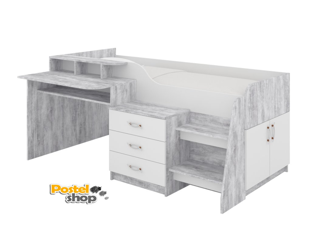 Dětská zvýšená postel SPEYS 200x90 cm je ideálním řešením pro efektivní využití prostoru v dětském pokoji. Tato praktická patrová postel s výsuvným psacím stolem, zásuvkovou komodou a skříňkou v jednom je navržena tak, aby poskytla dostatek úložného prostoru a zároveň nabízela pohodlné místo pro spánek.