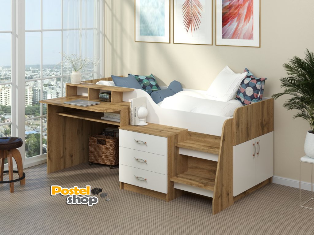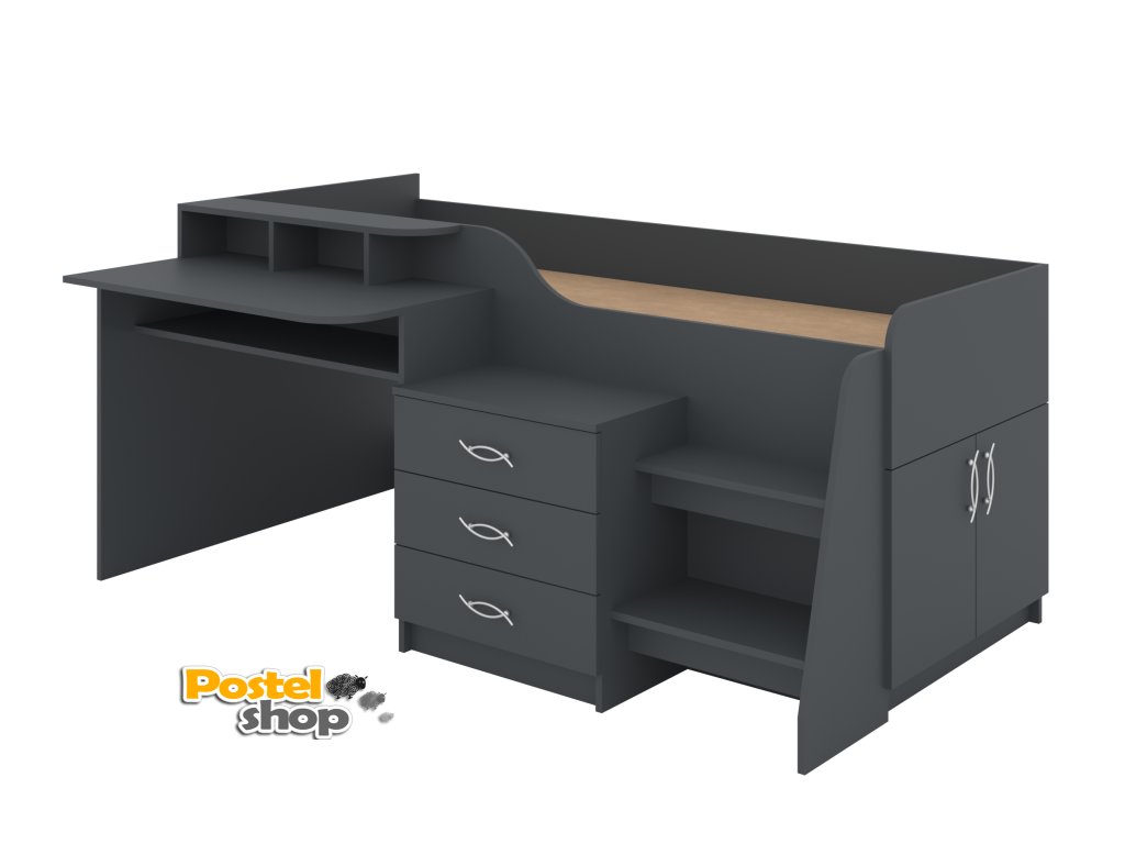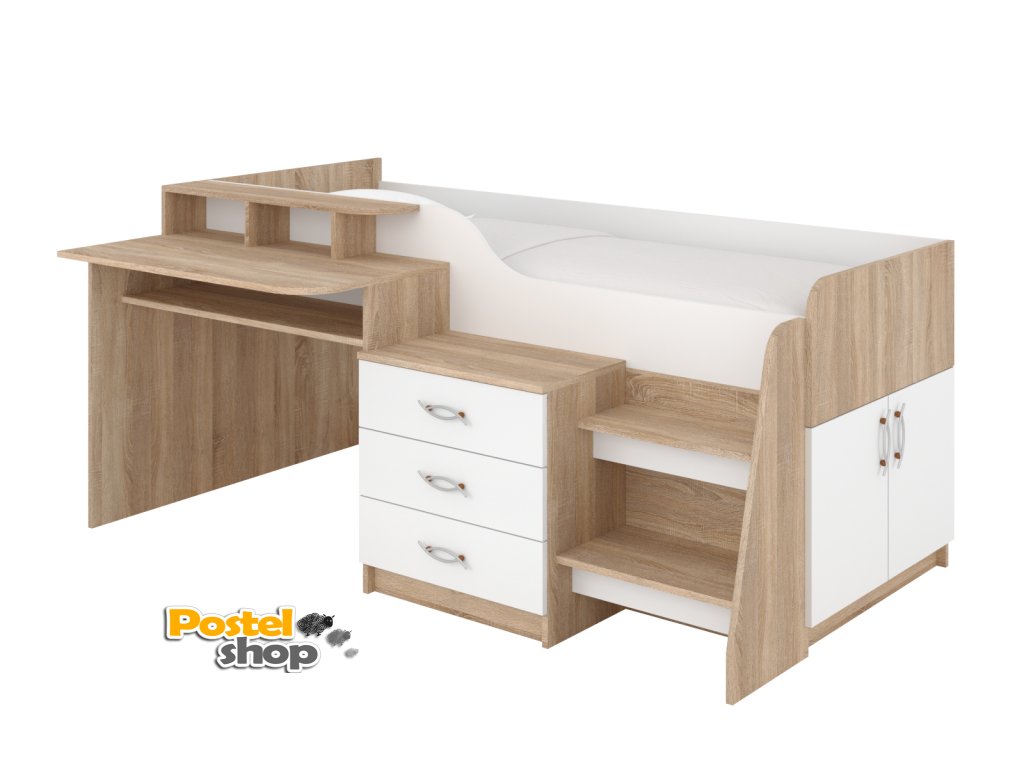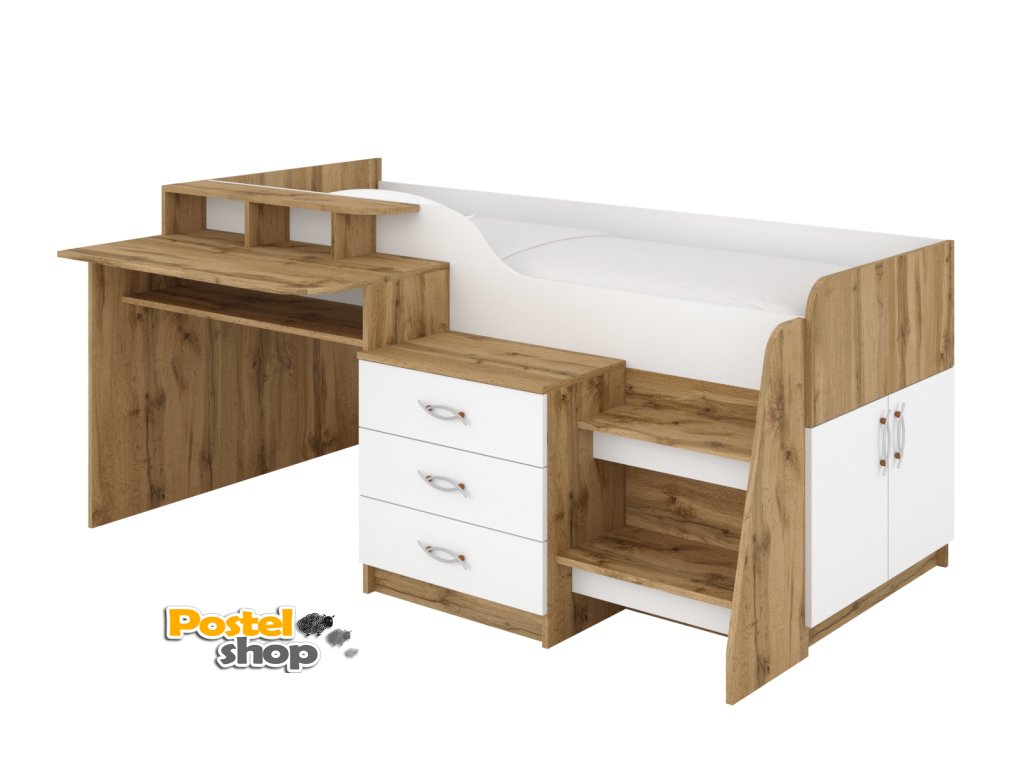 - Prostorově úsporná: Zvýšený design umožňuje uložení psacího stolu, komody a skříňky pod postelí, což šetří místo v pokoji.