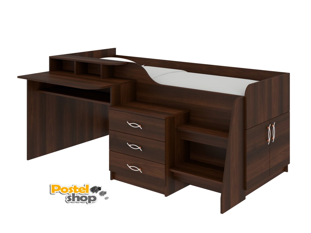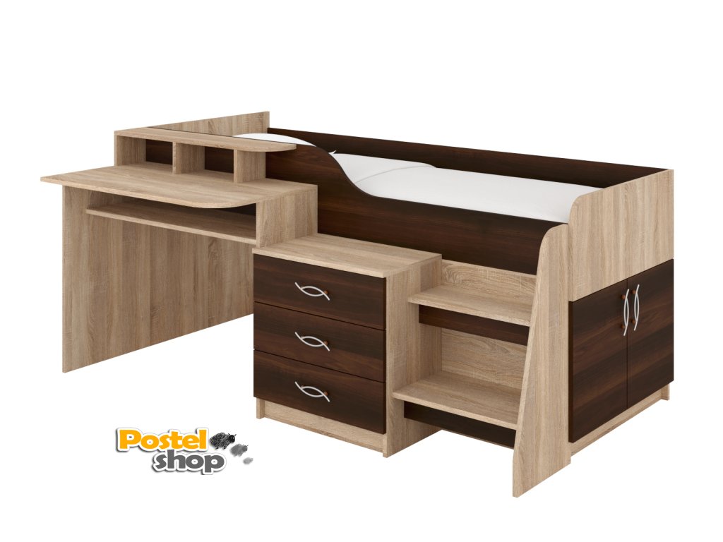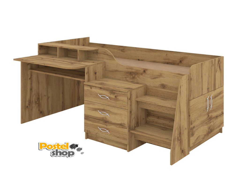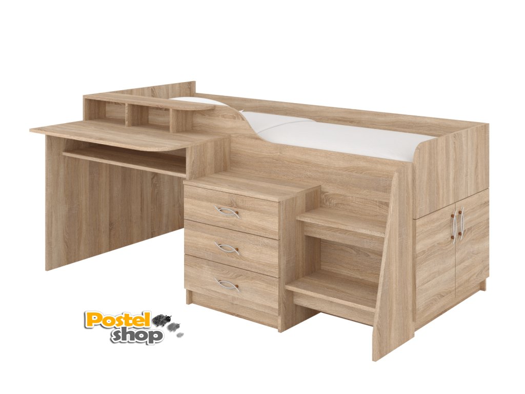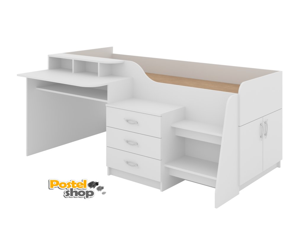 - Prostorově úsporná: Zvýšený design umožňuje uložení psacího stolu, komody a skříňky pod postelí, což šetří místo v pokoji.