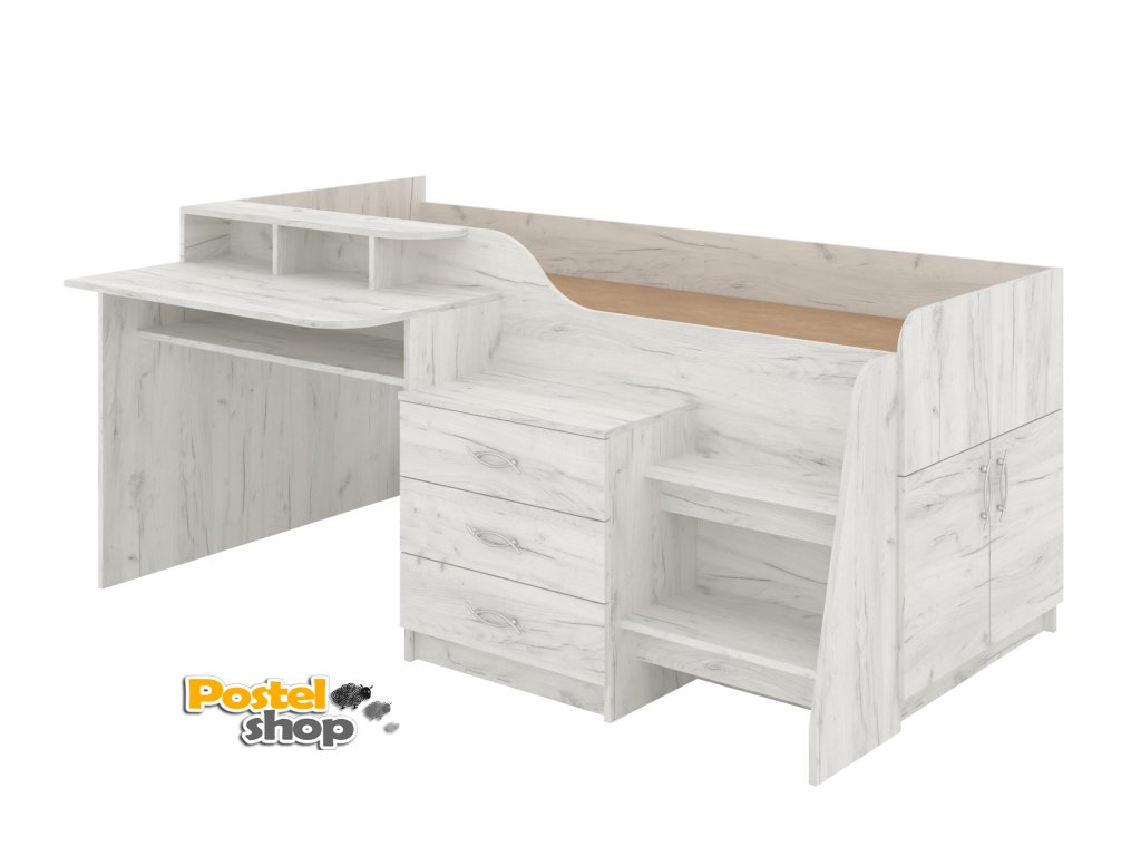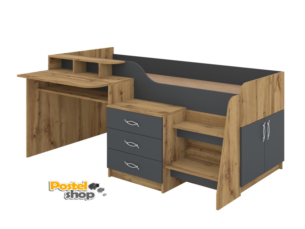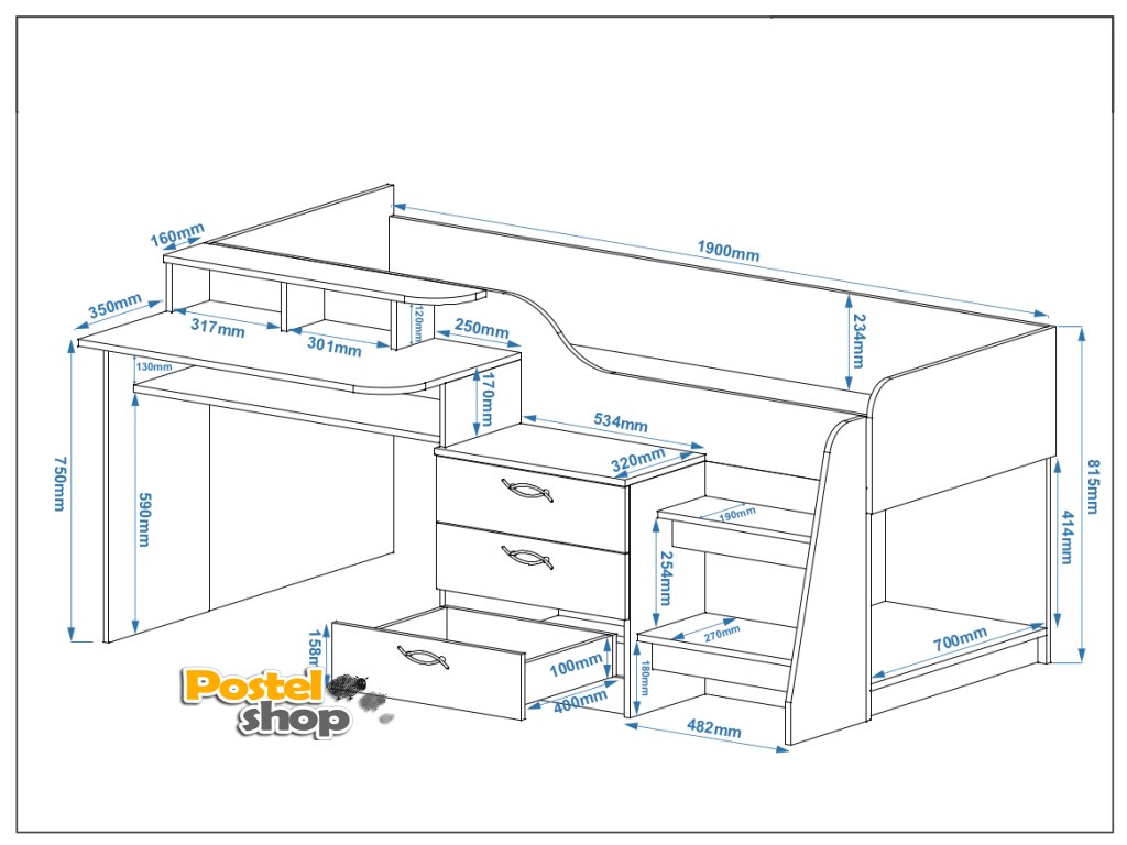 Dětská zvýšená postel 190x70 cm je ideálním řešením pro efektivní využití prostoru v dětském pokoji. Tato praktická patrová postel s výsuvným psacím stolem, zásuvkovou komodou a skříňkou v jednom je navržena tak, aby poskytla dostatek úložného prostoru a zároveň nabízela pohodlné místo pro spánek.