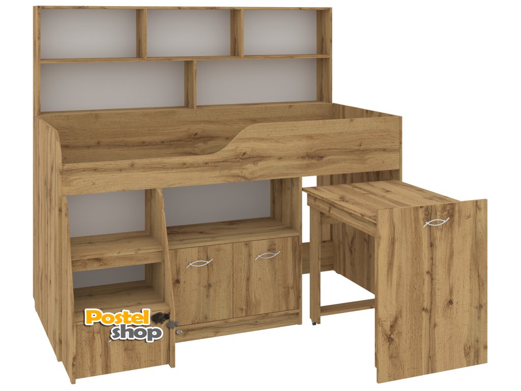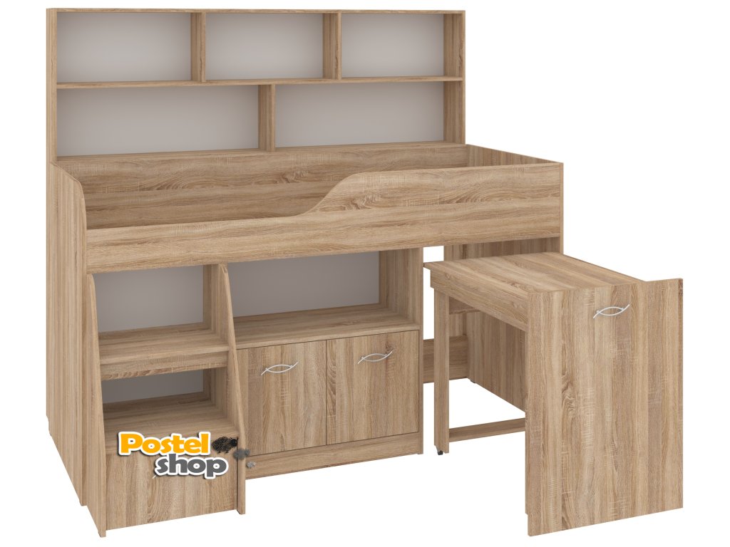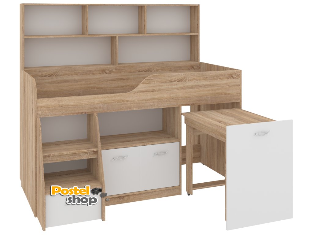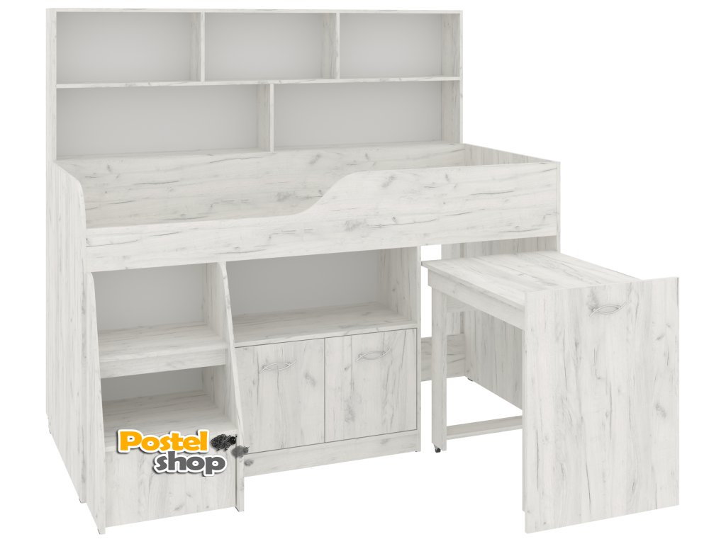 Výsuvný psací stůl, který je součástí postele, zaručí vašemu dítěti pohodlné místo pro učení, kreslení nebo hraní. Pod postelí se nachází skříňka a prostorná zásuvka, které nabízejí spoustu úložného prostoru pro knihy, hračky nebo oblečení. K tomu všemu přidává policový regál, který pomůže uspořádat vše potřebné.