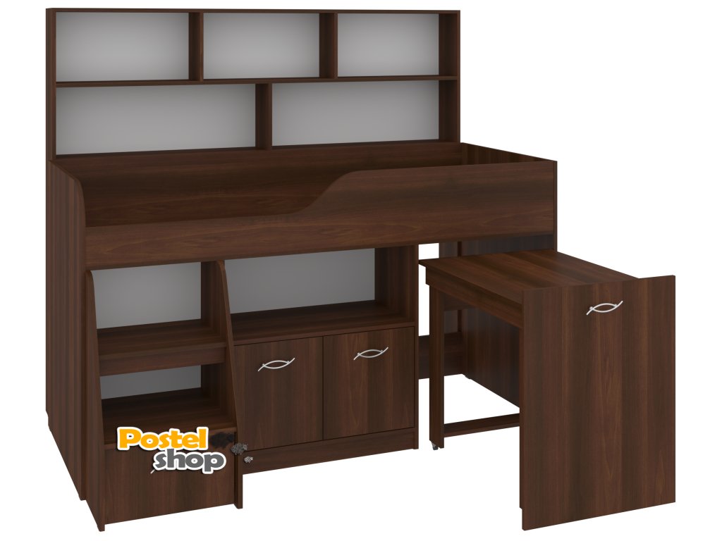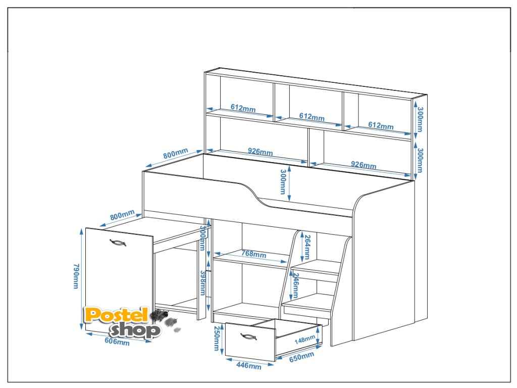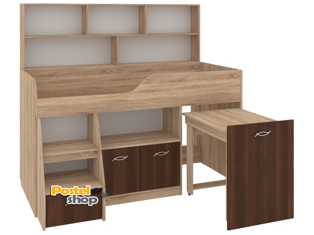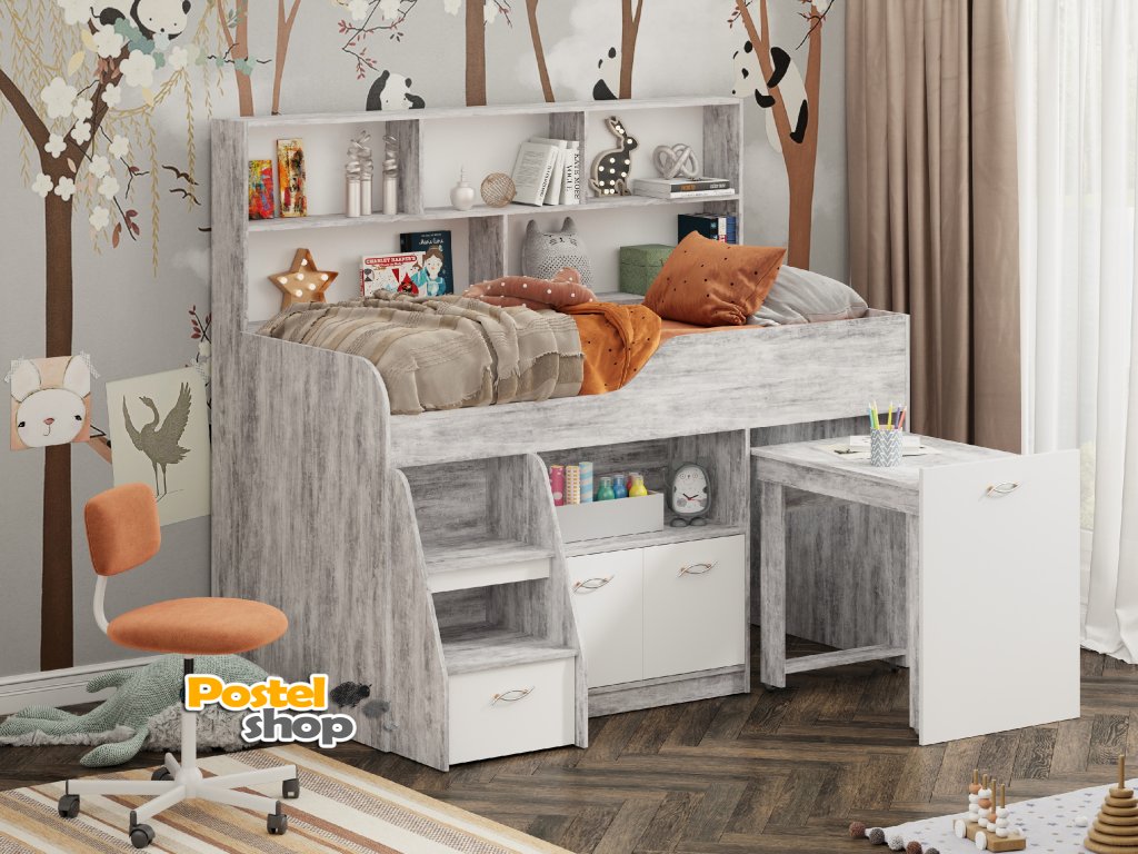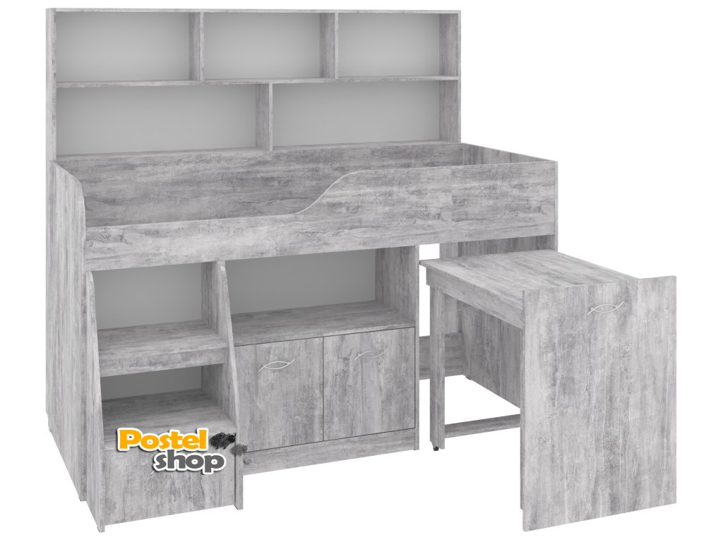 Výsuvný psací stůl, který je součástí postele, zaručí vašemu dítěti pohodlné místo pro učení, kreslení nebo hraní. Pod postelí se nachází skříňka a prostorná zásuvka, které nabízejí spoustu úložného prostoru pro knihy, hračky nebo oblečení. K tomu všemu přidává policový regál, který pomůže uspořádat vše potřebné.