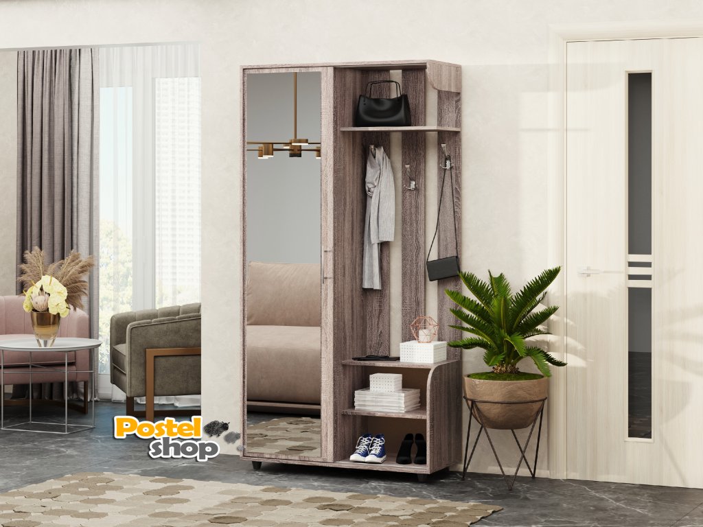 - Praktické uspořádání: Všechny potřebné funkce v jednom kuse nábytku – věšák, botník a šatní skříň s výsuvnou tyčí.
