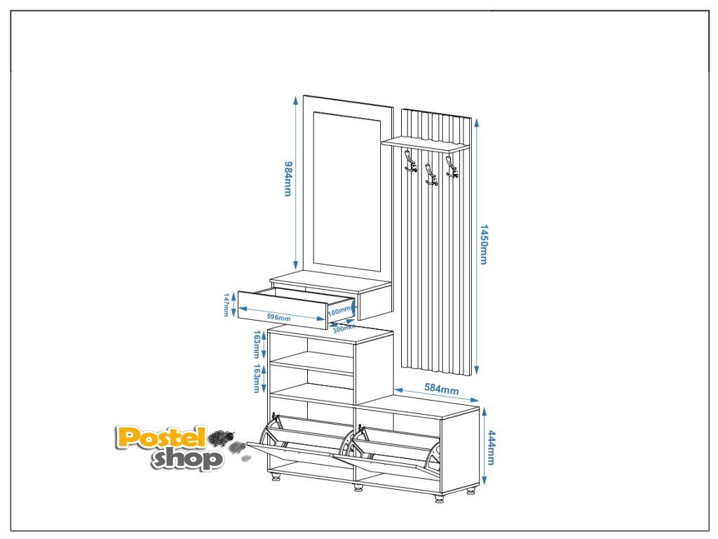 - Optimalizovaný úložný prostor: Dvě řady botníků, věšák, polička a zásuvka vám umožní udržet vše potřebné na jednom místě.