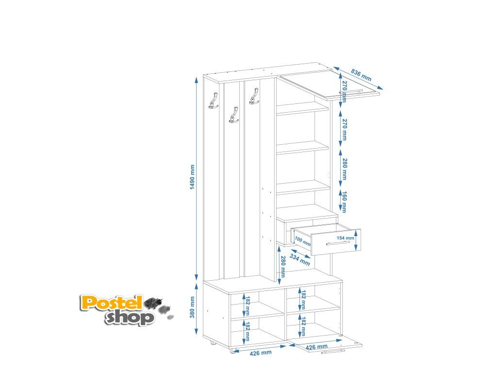 - Prostorově úsporné: Díky kompaktním rozměrům (výška 197 cm, šířka 90 cm, hloubka 42 cm) se hodí i do menších předsíní.