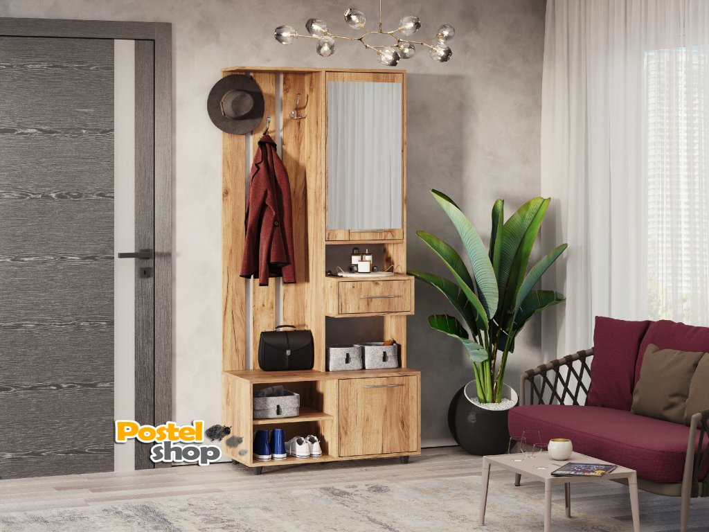 - Praktičnost a organizace: Zrcadlo, věšák, zásuvka a botník pro efektivní využití prostoru.