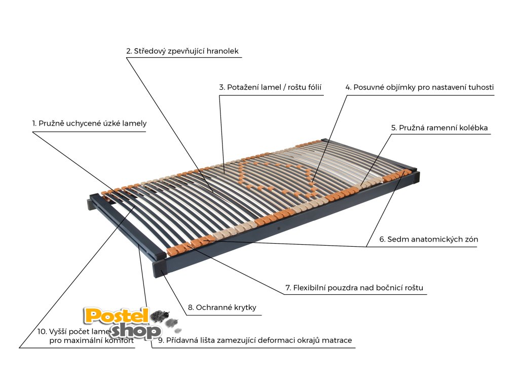 Rošt disponuje celkem 42 lamelami, dokáže tak velmi dobře spolupracovat s matrací a rovnoměrně roznášet váhu těla.