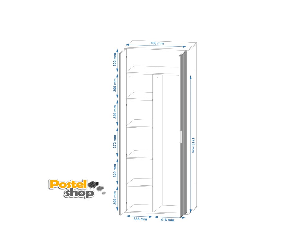Skříň je vybavena čtyřmi praktickými policemi pro uložení obuvi, tašek, nebo sezónního oblečení, zatímco šatní tyč poskytuje prostor pro pověšení košil, kabátů a dalších oděvů. Díky rozměrům (šířka 80 cm, hloubka 52 cm, výška 207 cm) se skříň skvěle hodí i do menších prostor, jako jsou předsíně, ložnice nebo studentské pokoje. Moderní vzhled z kvalitního MDF materiálu zaručuje dlouhou životnost a odolnost.