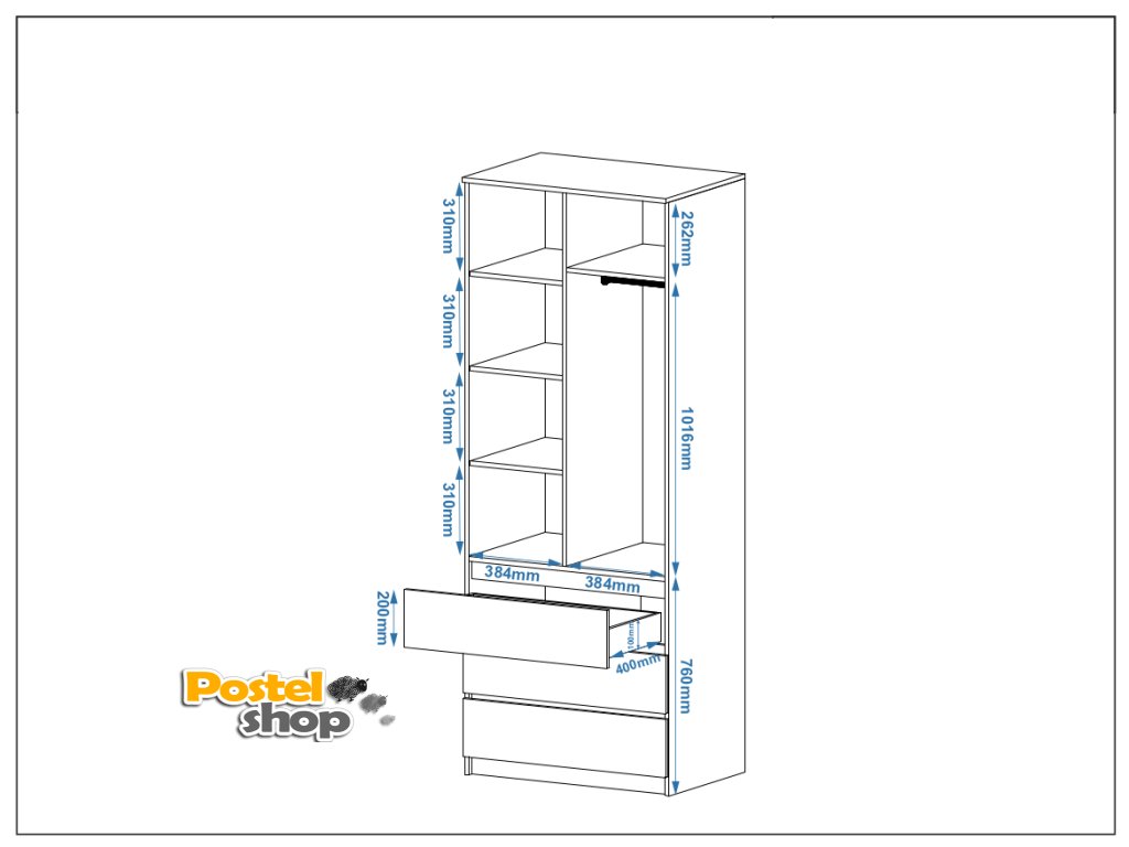 - Prostorný úložný prostor: Sestava obsahuje police, šatní tyč a tři zásuvky, což vám umožní uspořádat všechny vaše věci efektivně.