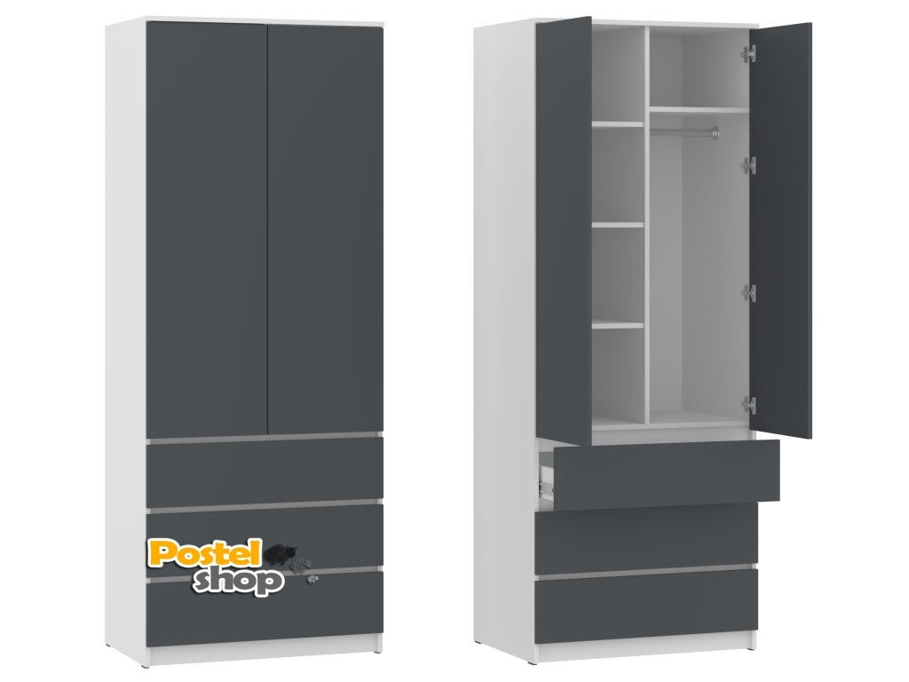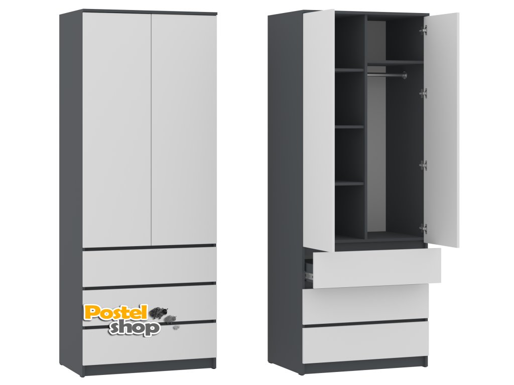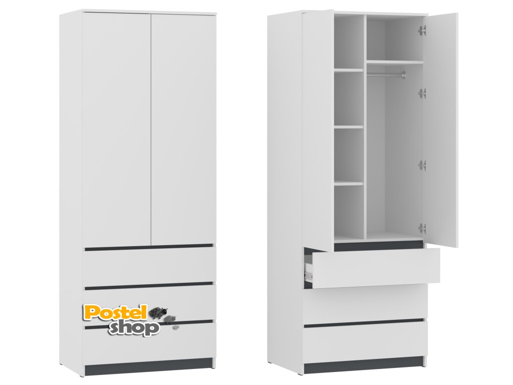 Vylepšete svůj interiér praktickou a moderní šatní skříní H II "NEW SYSTEM". Tato prostorná dvoudvéřová skříň je ideální volbou pro každodenní uložení oblečení a dalších věcí. S výškou 207 cm, šířkou 80 cm a hloubkou 54 cm nabízí dostatek prostoru pro vaše věci, aniž by zabírala příliš mnoho místa. Skříň je vybavena praktickými policemi pro uspořádání drobných předmětů, šatní tyčí pro pohodlné zavěšení oblečení a třemi zásuvkami pro uložení prádla, doplňků nebo dalších věcí, které chcete mít po ruce.
