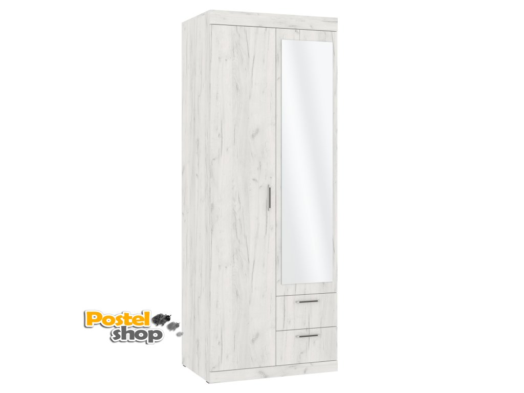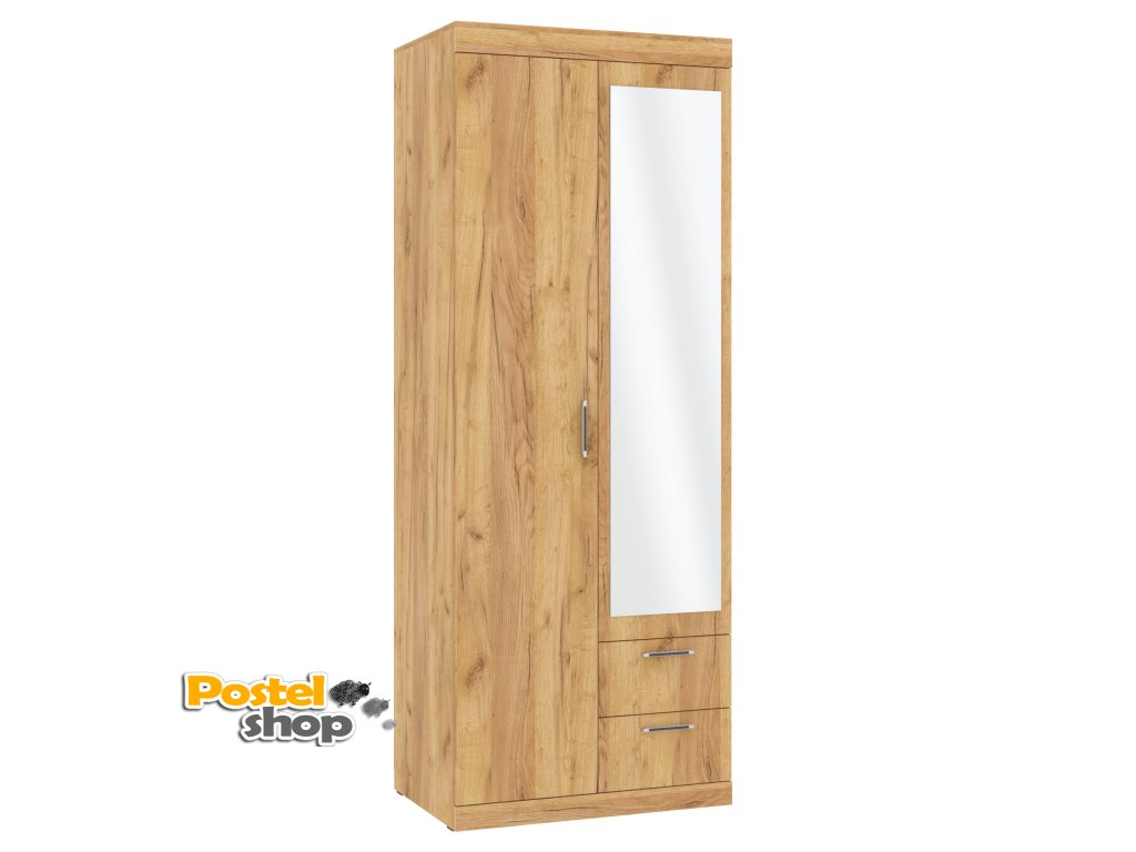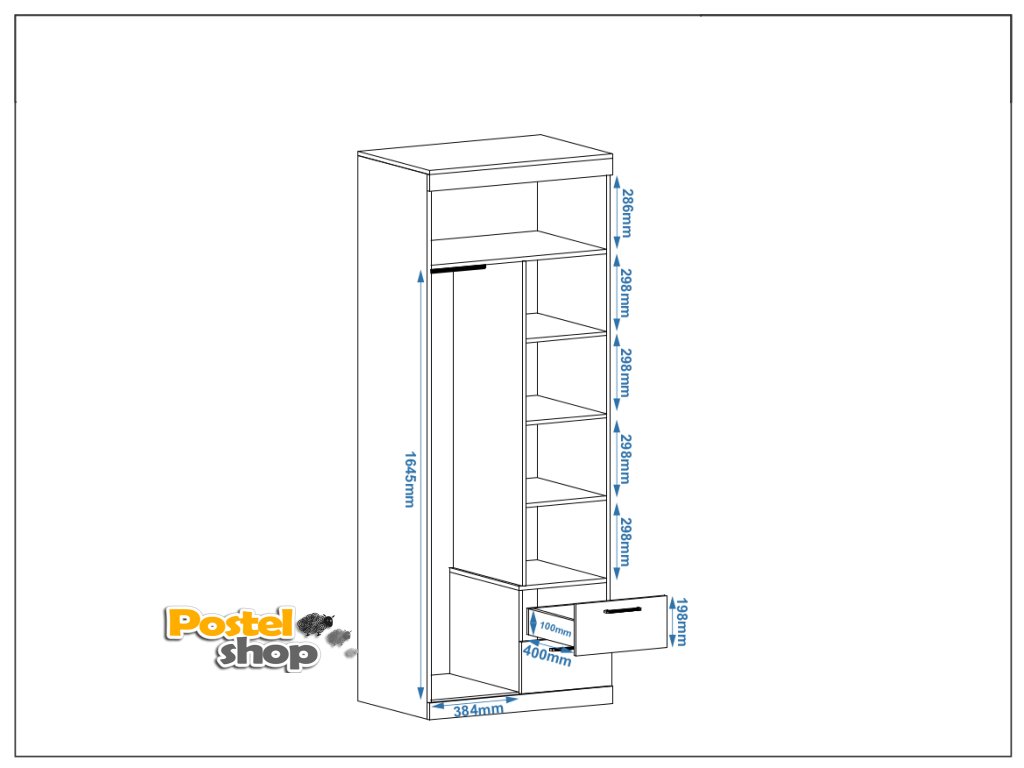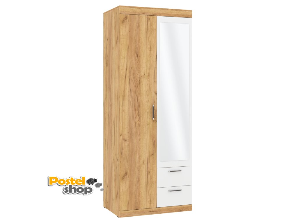 Uvnitř skříně se nachází tři praktické police nad zásuvkami, které skvěle poslouží pro uložení drobných předmětů nebo sezónního oblečení. V druhé polovině skříně je umístěna šatní tyč, která umožňuje zavěšení oblečení na ramínkách. Navíc ve vrchní části je široká police o výšce 29 cm, která poskytuje ideální prostor pro uskladnění různých věcí, které chcete mít po ruce.