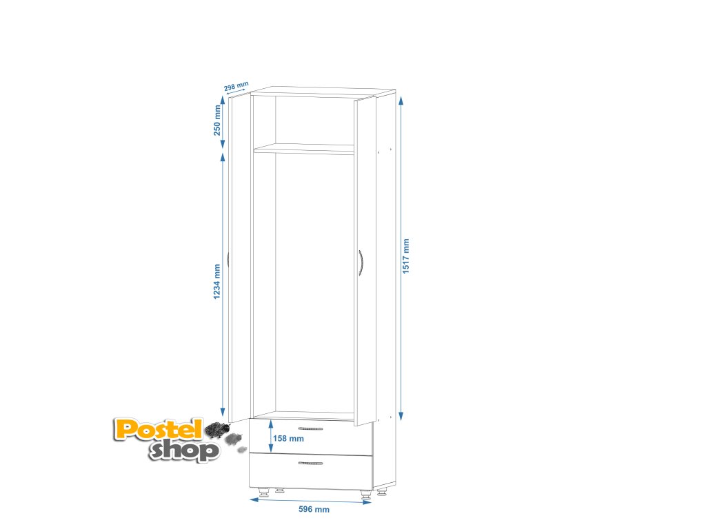 - Praktický design – Šatní výsuv, horní police a dvě zásuvky pro pohodlné uskladnění oblečení a drobností.
