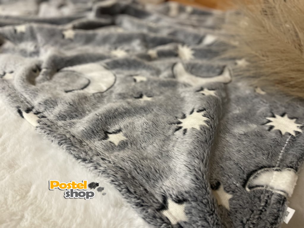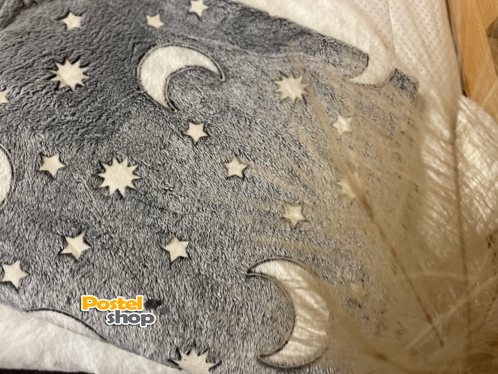 NOVINKA ! Heboučká deka z mikrovlákna, která prozáří i ty nejšedivější dny, a to doslova. .Ve tmě krásně svítí. gramáž 240. Neutrální šedý podklad totiž zdobí spousta malých i velkých hvězdiček a planetek které ve tmě opravdu svítí