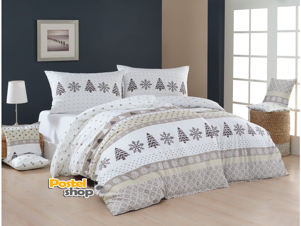 Povlak na přikrývku je z obou stran stejný, povlak na polštář zdobí z jedné strany motiv stromků na bílém podkladu, spodní stranu tvoří bílo-hnědý dekorativní vzor ze spodní části povlaku na přikrývku. Povlečení je opatřeno komfortním zipovým uzávěrem.